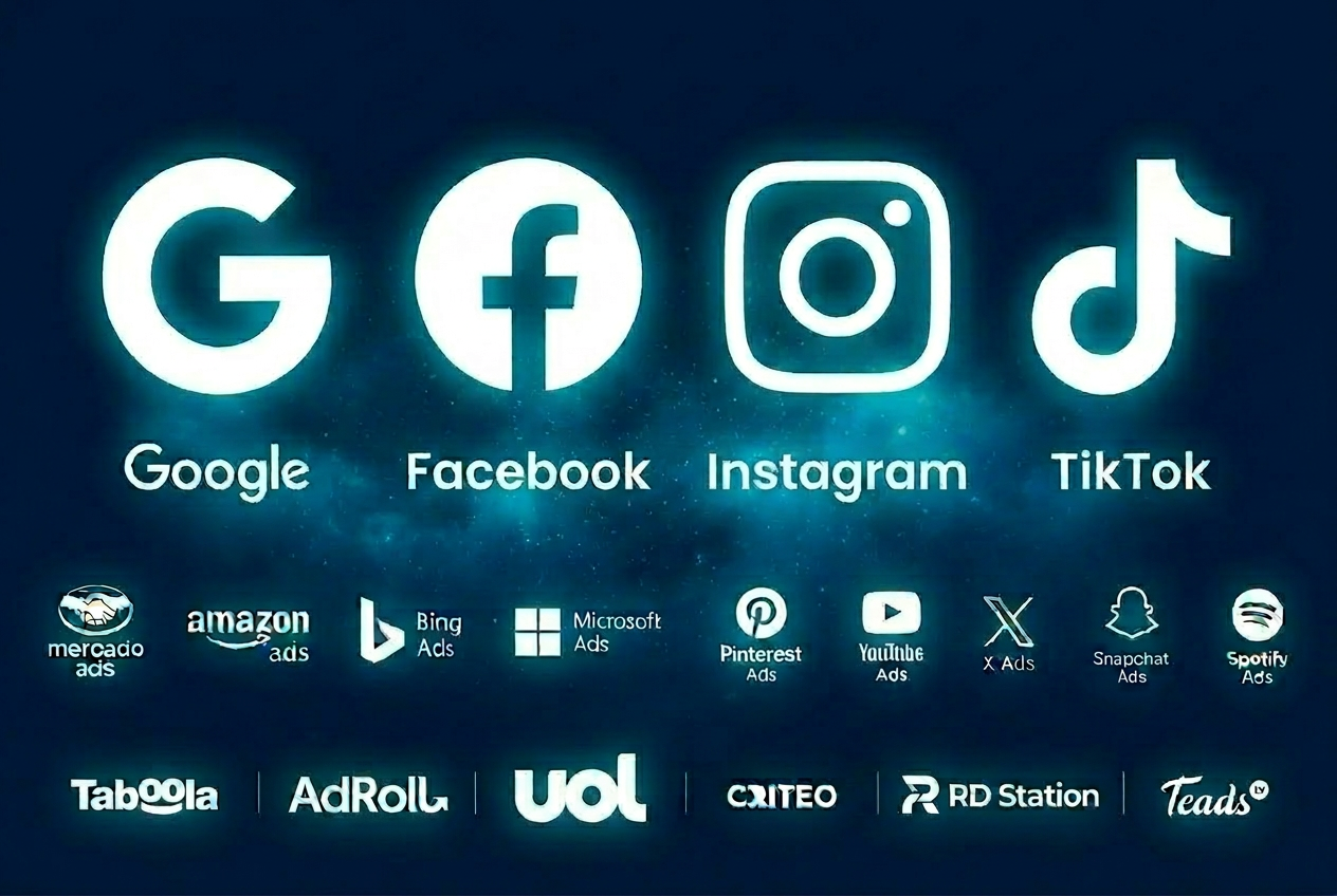 Gestão de Google Ads, Meta Ads (Instagram e Facebook), TikTok, LinkedIn, Mercado Ads, Amazon Ads, Mídia Programática, Afiliados, Retargeting e muito mais!